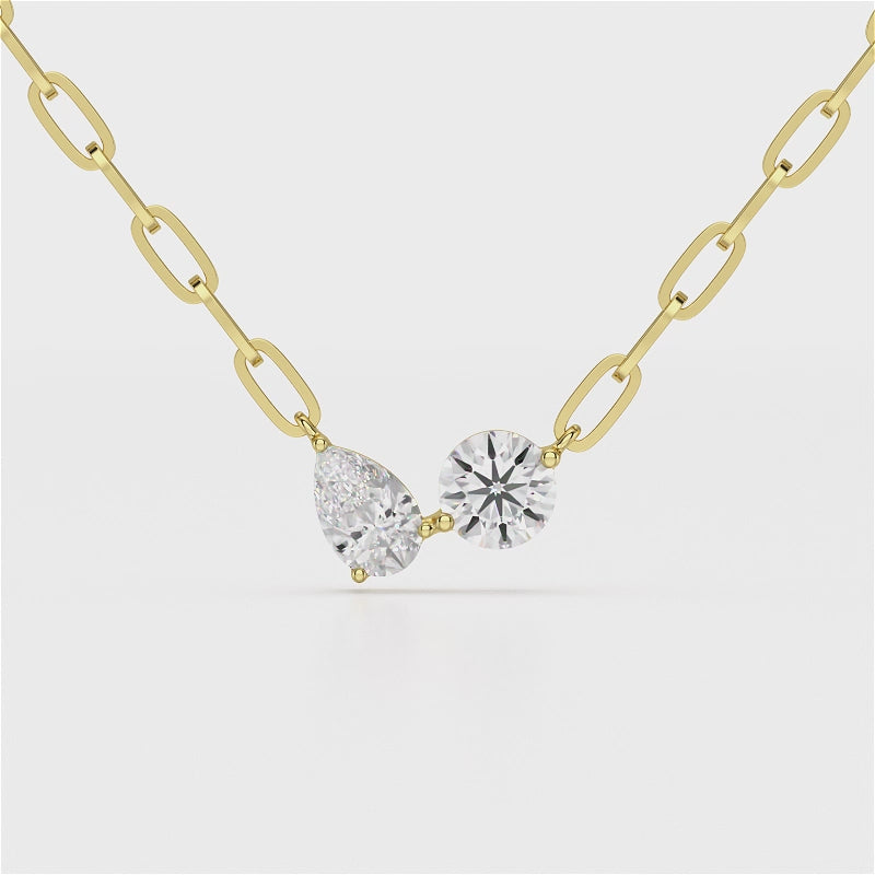 Celebrate the essence of love with our exquisite collection of lab-grown solitaire Pear & Round shaped necklace in a 18 inch or 16 inch paper clip chain in 14kyg. Crafted with precision and passion, these timeless pieces are the perfect expression of your deepest emotions. Embrace the beauty of sustainable luxury and let your love shine bright this Valentine's Day.