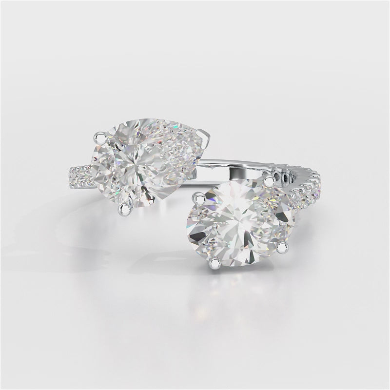 Discover the timeless elegance of our Two Stone Ring, featuring a pear and oval lab-grown diamond. This enchanting design symbolizes the past and future of your love story, with the pear-shaped diamond representing cherished memories and the oval-shaped diamond signifying endless possibilities. Available in F-G color and VS1-VS2 clarity, you can choose the perfect size for your unique journey. Personalize your ring with your choice of white, yellow, or rose gold, adding a touch of your distinctive style to this exceptional symbol of love. Embrace a love that transcends time with this exquisite Two Stone Engagement Ring.Available in other stone shape combinations as well.